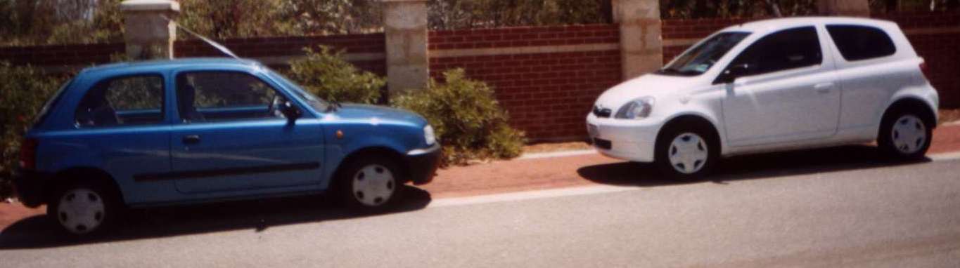 | Ons karre- the pretty blue one is mine- a Nissan Micra, nice and small, fits into any backpack. The easter-egg shaped one is the boss's- Toyota Echo. | 25-Apr-2001 17:54 GMT+2 |  |  |